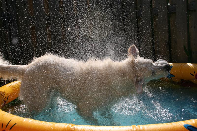 21-07-2006: we hebben de voortuin opnieuw laten bestraten. Klik hier voor meer foto's. Het weekend van 1 en 2 juli was het weer supermooi weer. Lekker naar het strand en de zee met Hayley dus. Maar ook in eigen tuin is het lekker. Zeker als de baasjes een eigen zwembadje hebben voor je!! Hieronder een paar foto's. Kijk op Hayley d'r site voor nog meer foto's.